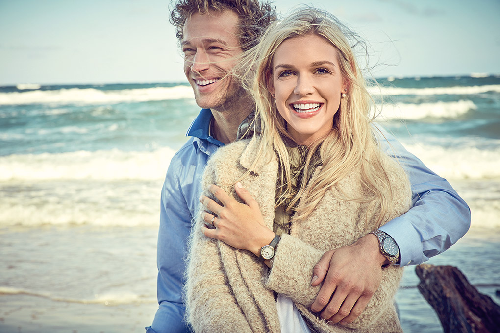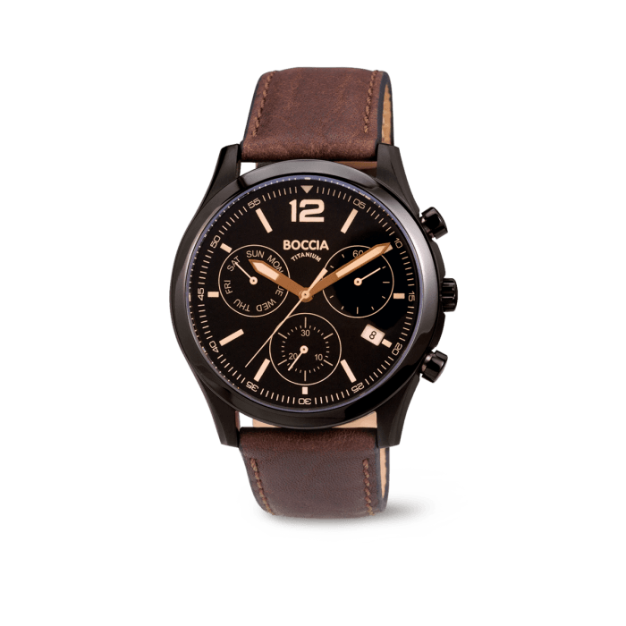 Ein spannender Materialmix setzt das reine Titan perfekt in Szene: Lederarmbänder, Voll-Keramik oder Plattierungen in Gelbgold oder Roségold sorgen für besondere Kontraste.